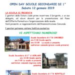 Si comunica che sabato 12 gennaio 2019 presso le sedi delle scuole secondarie, avrà luogo l’OPEN DAY per i genitori delle future classi prime.