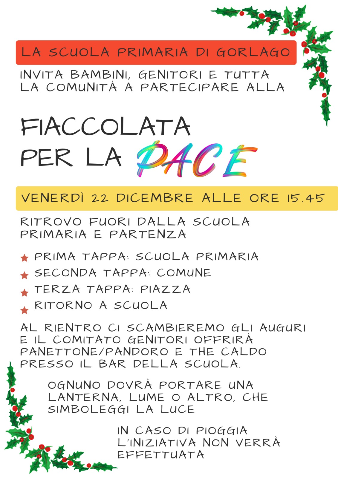 Si invita tutta la comunità scolastica all’evento “Fiaccolata per la pace”, che si terrà VENERDI’ 22 dicembre alle ore 15:45 con ritrovo all’ingresso della scuola primaria di Gorlago.