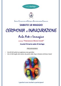 Si comunica che sabato 18 maggio alle 9.30 presso la scuola primaria di Gorlago sarà inaugurata l’aula di Arte e Immagine intitolata a “Francesca e Bruno Corali”.