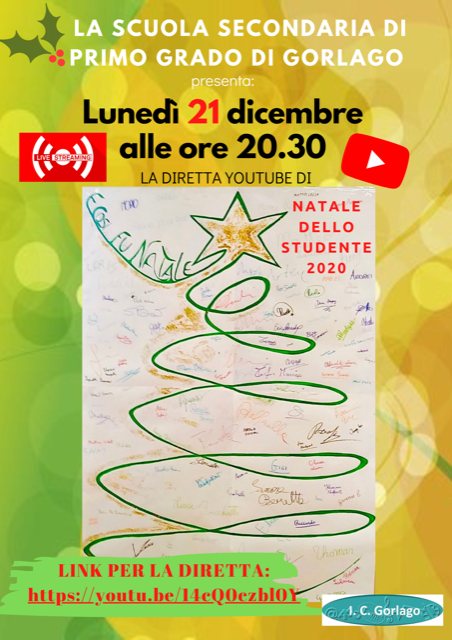 La scuola media di Gorlago è lieta di invitarvi lunedì 21 dicembre 2020 alle ore 20.30, alla diretta streaming del “Natale dello Studente 2020“.
